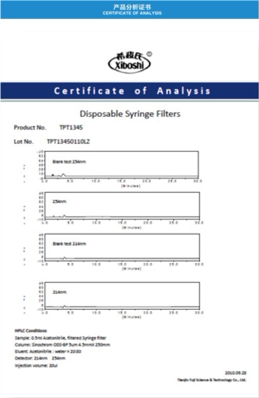 本公司對出廠(chǎng)的每個(gè)批次的HPLC級一次性針頭式樣品過(guò)濾器